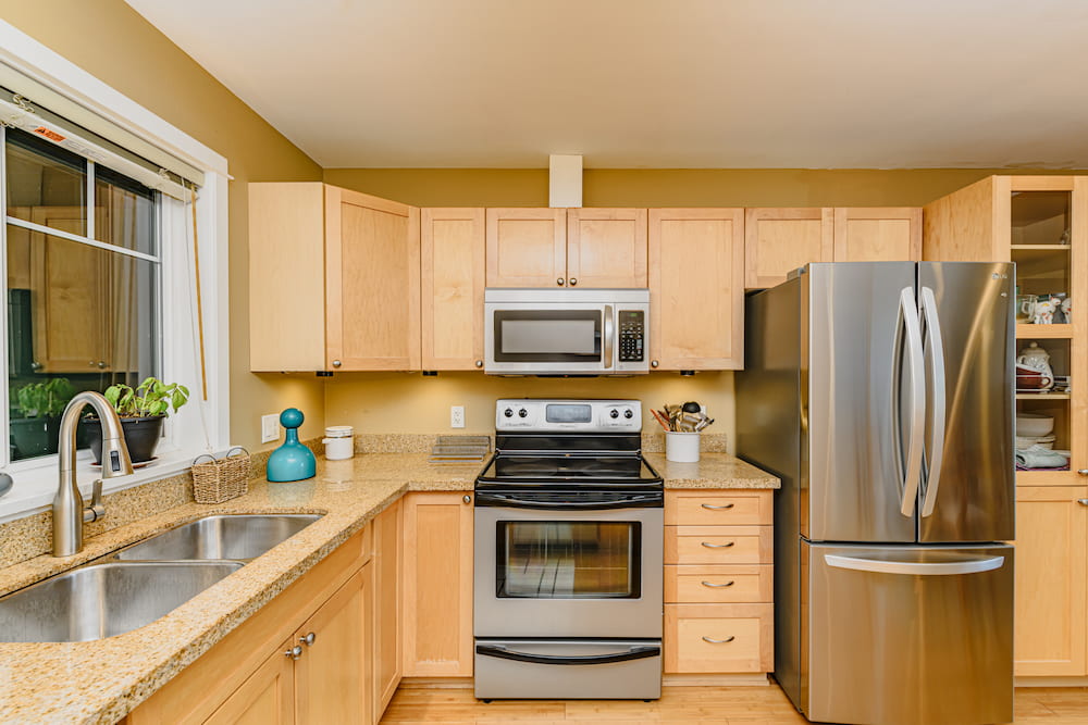 Bright, Updated Home with Suite in Sought-After Heron’s Wood! This 3-bed, 2-bath, 1,773 sq ft gem features vaulted ceilings with skylights, a cozy gas fireplace, and fresh interior & exterior paint. Built in 2009, it offers durable Hardie Board siding, an automatic sprinkler system, and inviting front/rear porches. The main level shines with a bright kitchen boasting quartz counters, new stainless appliances, and peaceful garden views. Downstairs, a private suite with full kitchen is ideal for in-laws, teens, or rental income. Enjoy a single garage with storage, easy-care landscaping, and a friendly cul-de-sac steps from trails, parks, and schools. Move-in ready, income potential, and a prime location—this home truly has it all!